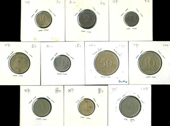 1922-36 愛莎尼亞 1,2,10,50 Cents, 1,3,5,10 Marka (不同) VF-AU 編號:NIL(共10枚)