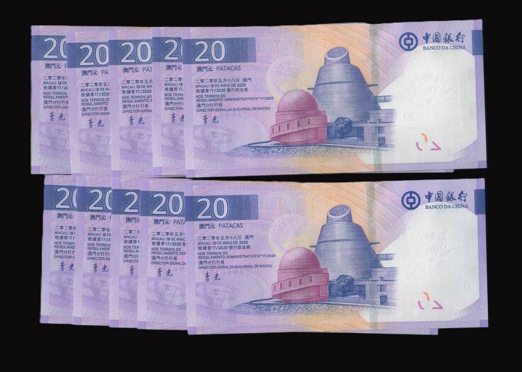 2020 澳門中國銀行 20 Patacas UNC 編號:ZA663141-50(共10張,補版連號,頂級雪白)