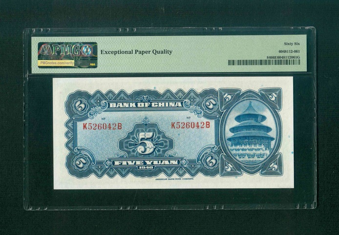 1940 中國銀行 $5 PMG 66 EPQ 編號:K526042B(頂級雪白)