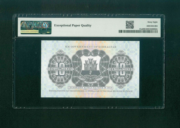 2018 直布羅陀紀念鈔 10/-Shilling PMG 68 EPQ 編號:8K0136549(頂級雪白)