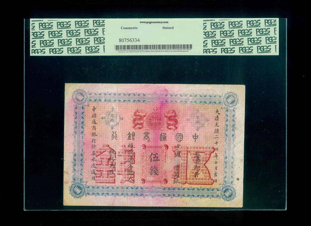 1898 中國通商銀行 伍錢 PCGS 20 編號: 76179, 清鈔系列, 有污漬