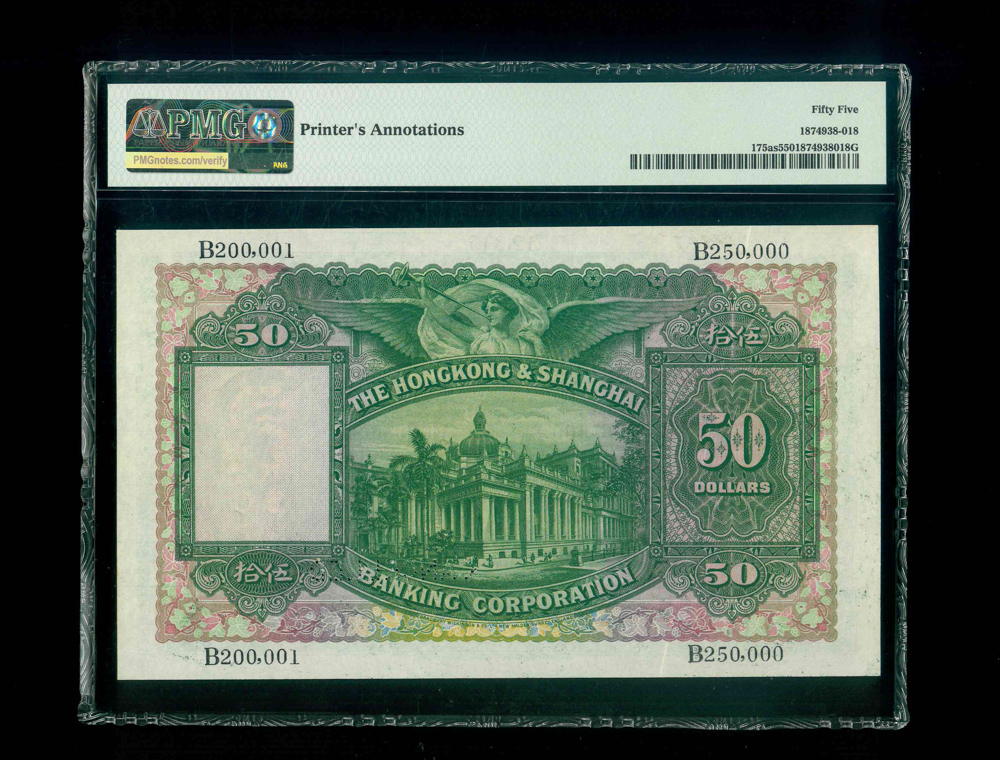 1927 香港上海匯豐銀行$50 PMG 55 編號: B000000, 樣鈔