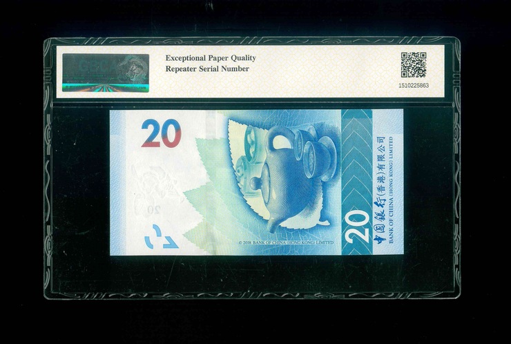 2021 香港中國銀行 $20 GBCA 66 EPQ 編號:DL521521(重複號,頂級雪白)