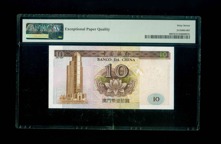 1995 澳門中國銀行$10 PMG 67 EPQ 編號: AY72287(頂級雪白)