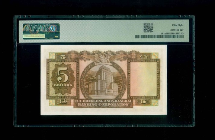 1960 香港上海滙豐銀行 $5 PMG 58 編號:296008 AV