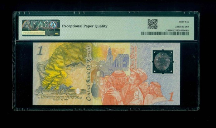 1993 Kuwait 科威特 1 Dinar PMG 66 EPQ 編號:CA208678(收藏系列紀念版,頂級雪白)