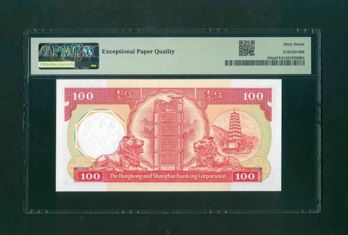1985 香港上海匯豐銀行$100 PMG 67 EPQ 編號: AA372761(頭版系列,頂級雪白)