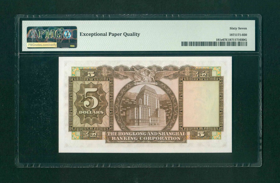 1975 香港上海匯豐銀行$5 PMG 67 EPQ 編號: 591730EJ(頂級雪白)