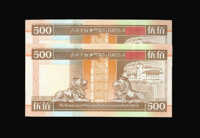 1999 香港上海滙豐銀行 $500 UNC 編號:DE122069-70(共2張,連號,頂級雪白)