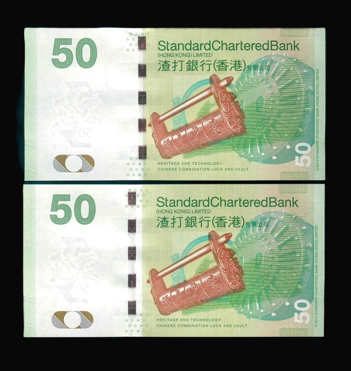 2010 香港渣打銀行 $50 UNC 編號:AA546788…(共2張,88尾頂級雪白)