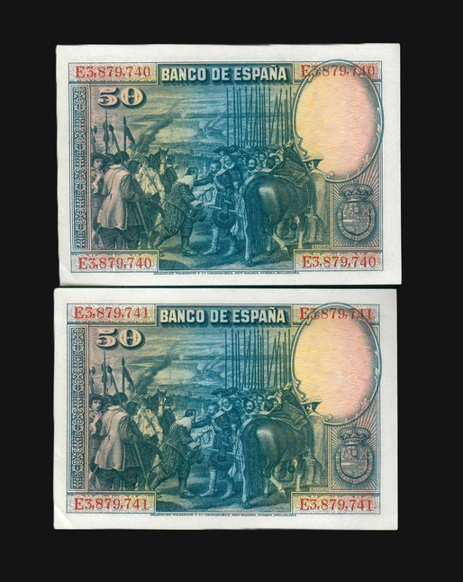 1928 西班牙 50 Pesetas UNC 編號:E3879740-41(共2張,連號)