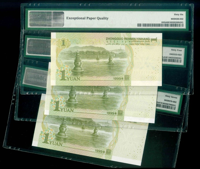 1999 中國人民銀行 $1 PMG 64-67 EPQ 編號:C3K1111111…(共3張,幸運全1,2,3/趣味小步高,頂級雪白)