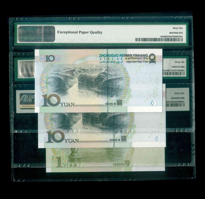1999/2005 中國人民銀行 $1 $10 PMG 66 EPQ 編號:L91E333333…(共3張,含全3,趣味號,頂級雪白)
