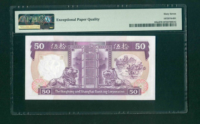 1992 香港上海匯豐銀行$50 PMG 67 EPQ 編號: BZ956272(頂級雪白)