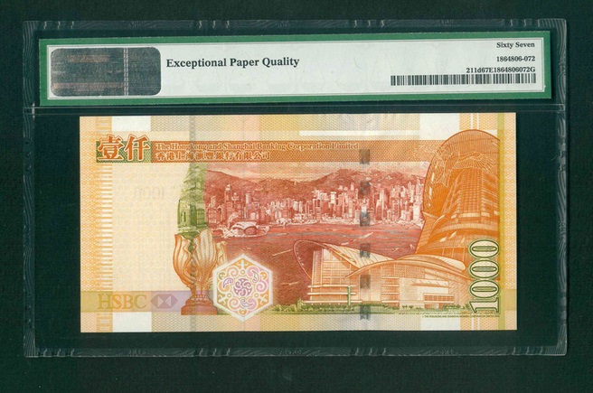 2007 香港上海匯豐銀行$1000 PMG 67 EPQ 編號: EE444400(四對子,頂級雪白)