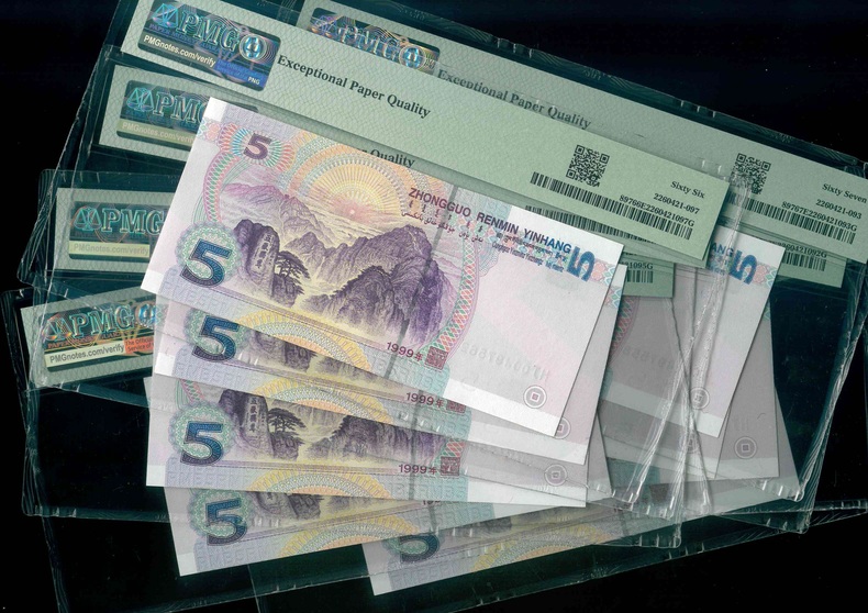 1999 中國人民銀行 $5 PMG 66-67 EPQ/PMG 64 編號:HJ00497555-62…(共8張,含連號/樣鈔)