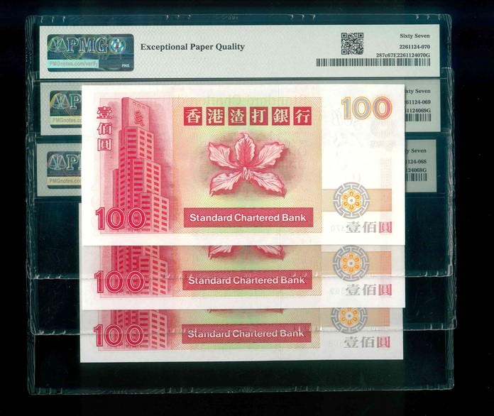 1999 香港渣打銀行 $100 PMG 67 EPQ 編號:FF968368-70(共3張,雙冠連號,頂級雪白)