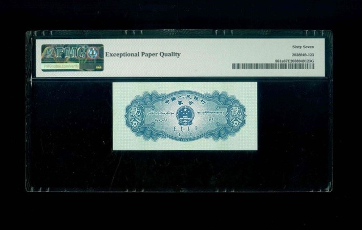 1953 中國人民銀行 2分 PMG 67 EPQ 編號:IV I VII 6423323(頂級雪白)