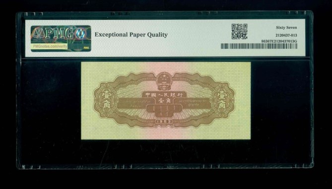 1953 中國人民銀行 壹角 PMG 67 EPQ 編號:IX X VIII 2383975(頂級雪白)