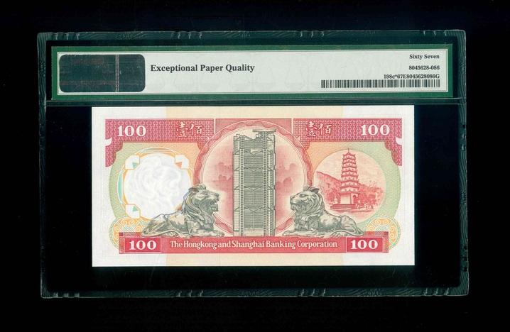 1991 香港上海滙豐銀行 $100 PMG 67 EPQ 編號:ZZ569444(補版豹子號,頂級雪白)