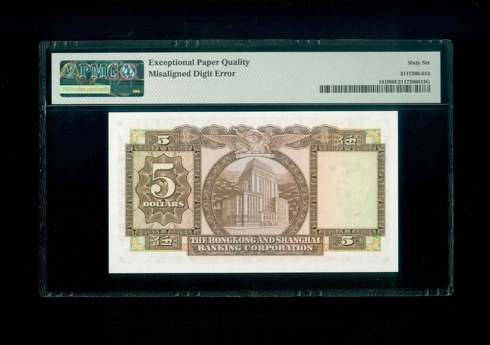 1973 香港上海滙豐銀行 $5 PMG 66 EPQ 編號:891126 EV(Misaligned Digit Error,頂級雪白)