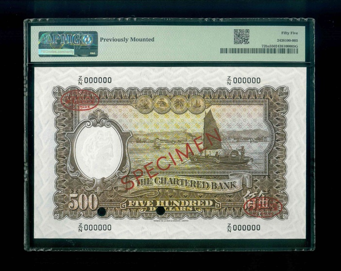 1962ND 香港渣打銀行 $500 PMG 55 編號:Z/N000000(樣鈔,Previously Mounted)