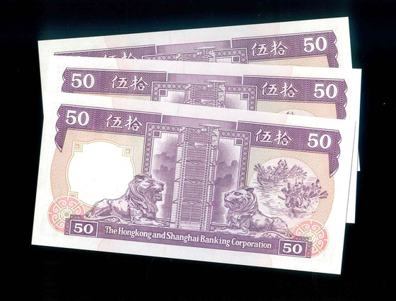 1992 香港上海滙豐銀行 $50 UNC 編號:BZ489485-87(共3張,連號)