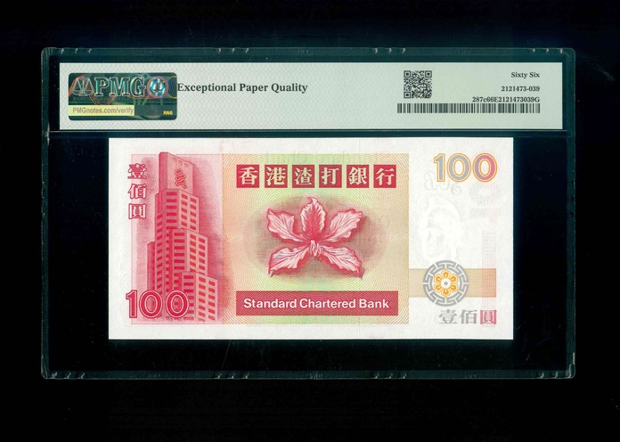 1999 香港渣打銀行 $100 PMG 66 EPQ 編號:FF968314(頂級雪白)
