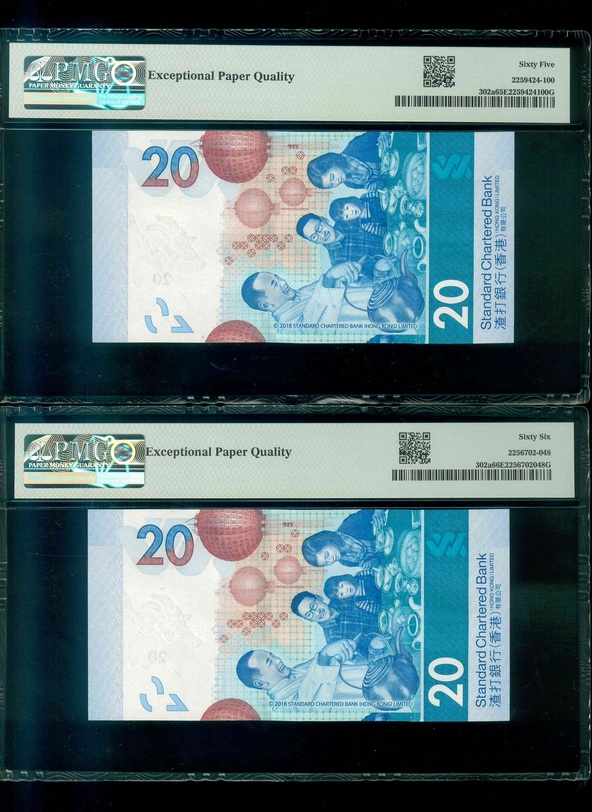 2018 香港渣打銀行 $20 PMG 65-66 EPQ 編號:BD/BE 206602(共2張,雷達同號,頂級雪白)