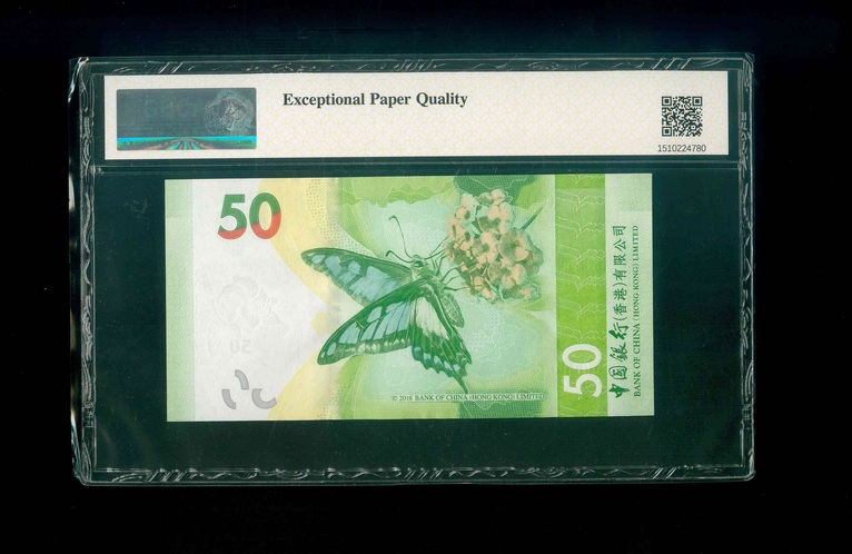 2018 香港中國銀行 $50 GBCA 66 EPQ 編號:AC000096(細號,頂級雪白)