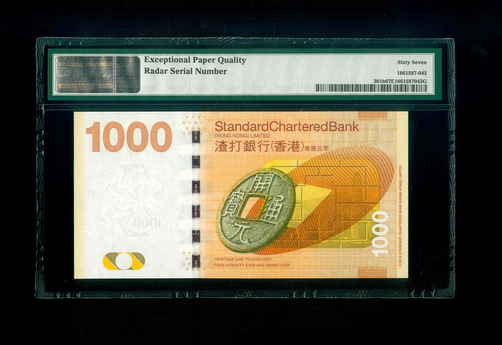 2012 香港渣打銀行 $1000 PMG 67 EPQ 編號:AY223322(三對子,頂級雪白)