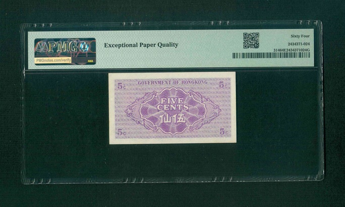 1941 香港政府 5 Cents PMG 64 EPQ 編號:0693521(白氏家族收藏精選,頂級雪白)