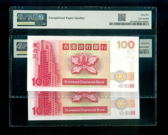1999 香港渣打銀行 $100 PMG 66 EPQ 編號:FF968357-58(共2張,連號,頂級雪白)