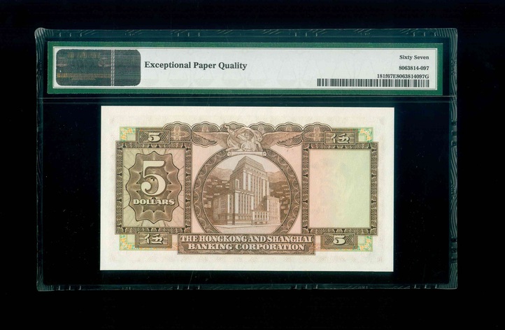 1973 香港上海滙豐銀行 $5 PMG 67 EPQ 編號:080056 FK(少有騎版,頂級雪白)
