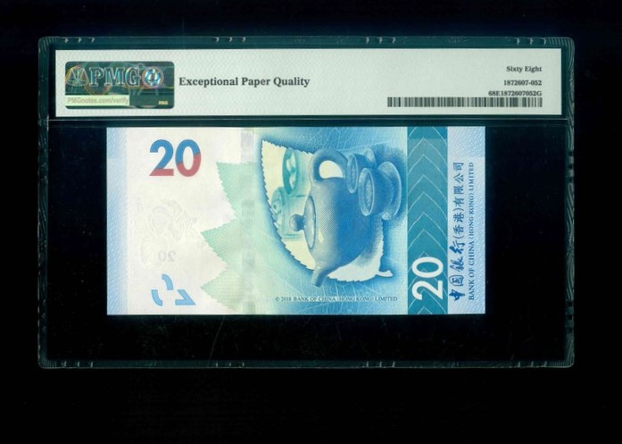 2018 香港中國銀行 $20 PMG 68 EPQ 編號:CG000049(細號,頂級雪白)