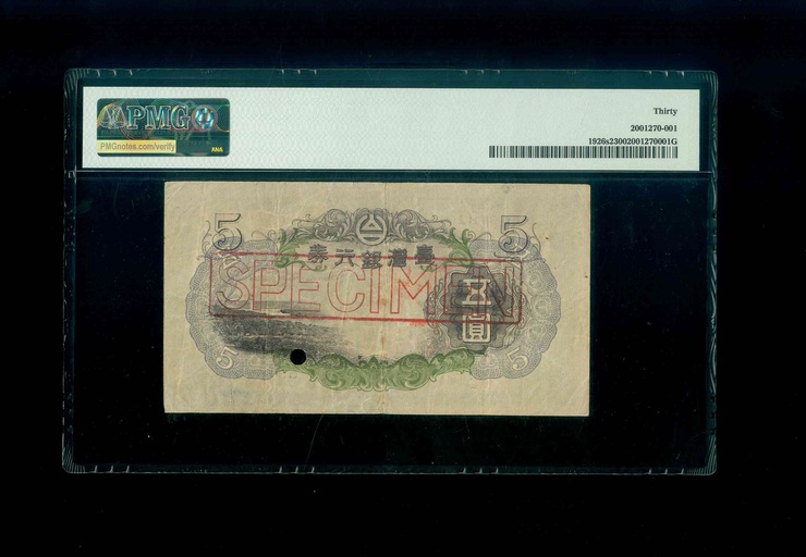 1934ND 台灣銀行劵 5圓 PMG 30 編號:051820(樣鈔)