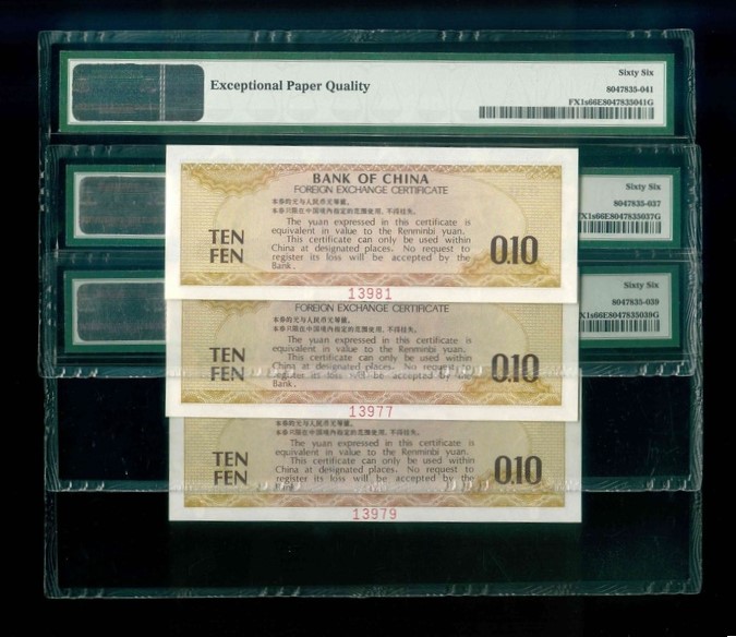 1979 中國銀行外滙兌換劵 壹角 PMG 66 EPQ 編號:ZA000000(共3張,樣鈔,頂級雪白)