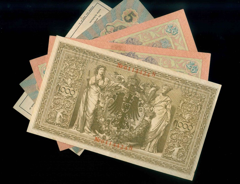 俄羅斯帝國時期 5,10盧布/ 德國 1000 Mark/ 美國人壽保險公司收據