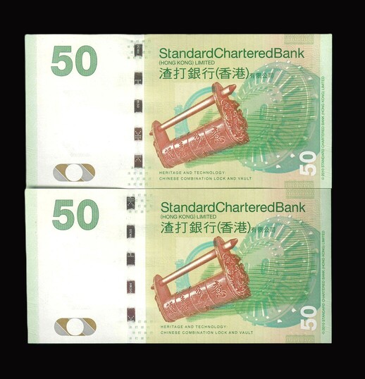 2012 香港渣打銀行 $50 UNC 編號:AP618618…(共2張,含重複號,8尾)