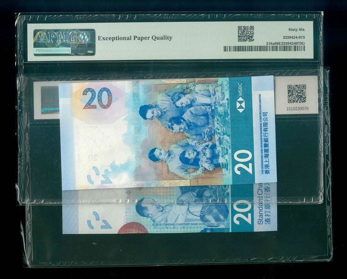 2018 香港渣打/ 上海滙豐銀行 $20 GBCA 68 EPQ/PMG 66 EPQ 編號:AE109901…(共2張,雷達號,頂級雪白)