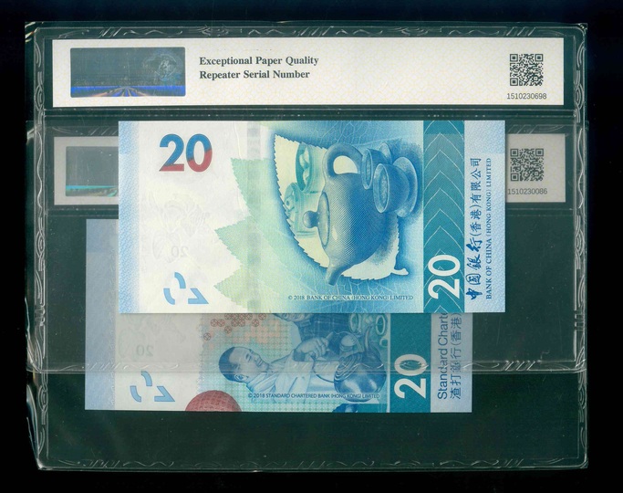 2018 香港渣打/ 中國銀行 $20 GBCA 66-67 EPQ 編號:BB479479…(共2張,含雙冠/重複號,頂級雪白)