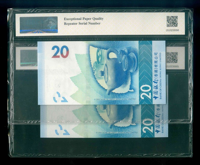 2018/2021 香港中國銀行 $20 GBCA 66-68 EPQ 編號:BM472472…(共2張,重複號,頂級雪白)