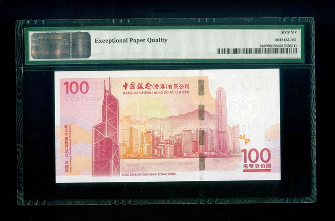 2012 香港中國銀行成立百週年紀念 $100 PMG 66 EPQ 編號:AB007699(補版系列,頂級雪白)