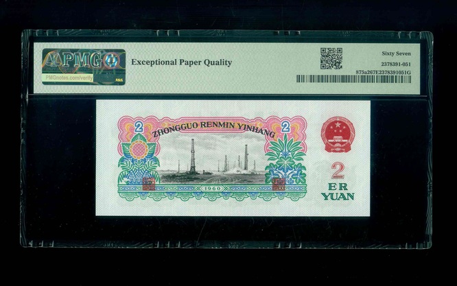 1960 中國人民銀行 $2 PMG 67 EPQ 編號:V III IX 5667605(頂級雪白)
