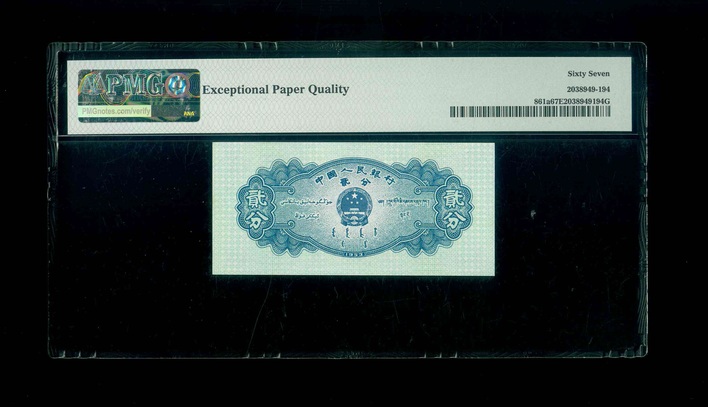 1953 中國人民銀行 2分 PMG 67 EPQ 編號:IV I VII 6423394(頂級雪白)