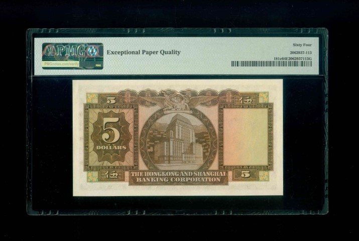 1965 香港上海滙豐銀行 $5 PMG 64 EPQ 編號:773100 BM(頂級雪白)