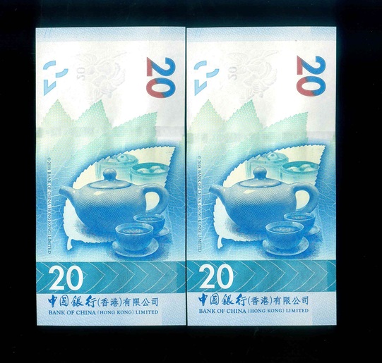 2023 香港中國銀行 $20 UNC 編號:KL877778/KL877777(共2張,含雷達/老虎號,頂級雪白)