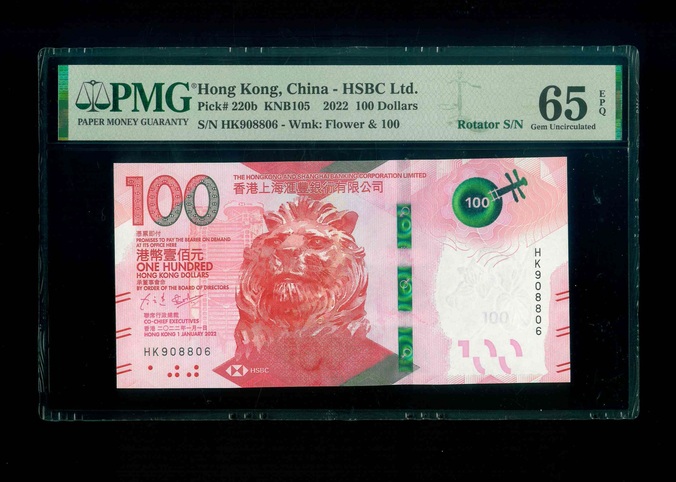 2022 香港上海滙豐銀行 $100 PMG 65 EPQ 編號:HK908806(旋轉號,頂級雪白)