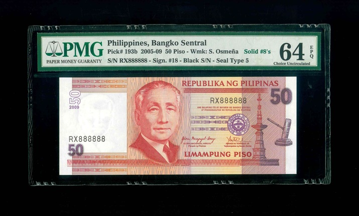 2009 菲律賓 50 Piso PMG 64 EPQ 編號:RX888888(幸運全8)