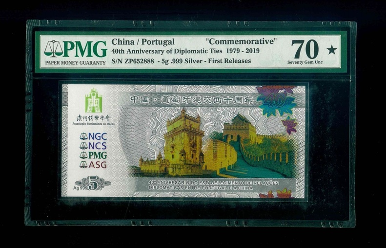 2019 中國/葡萄牙建交四十周年紀念銀片 PMG 70* 編號: ZP652888